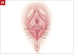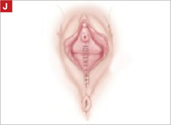Using several sutures, reapproximate the torn perineal fibromuscular structures in the midline to perform perineorraphy (FIGURE 2H). Close the distal vagina, beginning at the midpoint of the anterior transverse side, which lies at the urethrovesical junction (FIGURE 2I). Continue this suture on the posterior vagina and then the perineal body, sagittally, creating a small invagination in the distal vagina (FIGURE 2J).