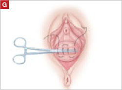 To ensure adherence of the anterior and posterior rectangles, stitch the raw surfaces together in three rows (FIGURE 2G). Do not include the distal 2 cm of the posterior vagina because you will need to leave room for perineorraphy.