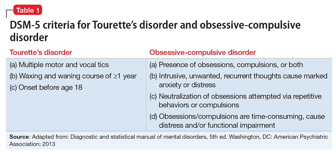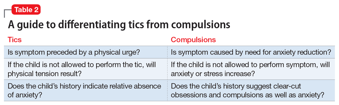It often is difficult to determine if complex motor or vocal tics are compulsions (Table 2). Indeed, the same biologic mechanisms are thought to be implicated in TD and OCD.4 A significant percentage of children with OCD have tics, and patients often report that they are unable to distinguish between compulsions and complex tics.5 Therefore, we thought that a reasonable differential included both TD and OCD, but more careful assessment over time was required.