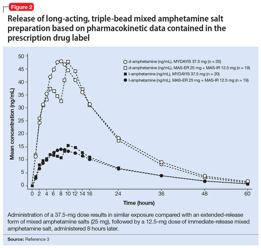 The encapsulated preparation contains 3 MAS beads: an immediate-release amphetamine salt bead, a pulsed-delayed release bead, and an extended-release bead (Figure 1), which give rise to a unique pharmacokinetic profile (Figure 2).3