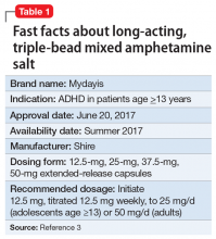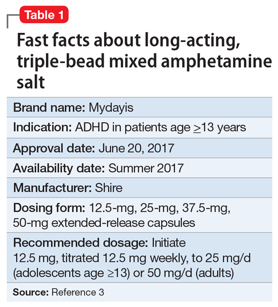 In June 2017, long-acting, triple-bead mixed amphetamine salt (MAS) was FDA-approved under the brand name Mydayis for the once-daily treatment of ADHD in adolescents (age ≥13) and adults (Table 1).3 This formulation utilizes a unique triple-bead technology to extend its duration of action. When this technology was developed—nearly a decade ago—it was hoped that the duration of action of the stimulant would be significantly increased, beyond the 10- to 12-hour duration of action of available stimulants at that time. This newly approved formulation provides 16 hours of coverage, and patients may experience an onset of action within 2 to 4 hours following administration.3