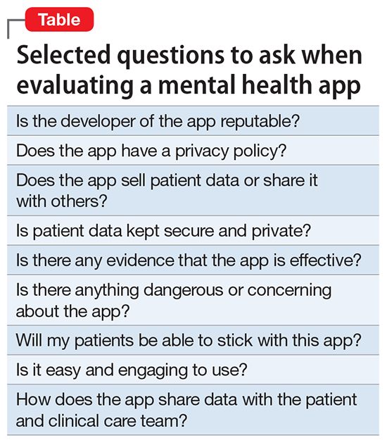 Ease of use. Across all health apps, there is growing recognition that most downloaded apps are never used. Patient engagement with mental health apps appears to rapidly decline over the first week of use.19 There also is emerging evidence that many apps are not user-friendly. A recent study of several common mood-tracking apps found that patients with depression had difficulty entering and accessing their data.20 Because many psychiatric disorders are chronic or last at least several months, it is especially important to consider how engaging and usable the app will be for your patient. Usability varies from patient to patient, so it is best to check directly with your patient regarding his comfort with apps and mobile technology. Offering check-ins and support to help patients keep on track with apps may be critical for successful outcomes.
