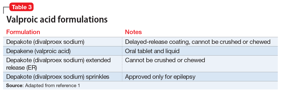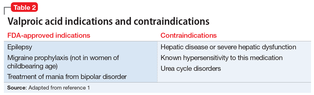 Valproic acid is FDA-approved for treating bipolar disorder, epilepsy, and migraine headaches1 (Table 21). Common adverse effects include nausea, vomiting, sleepiness, and dry mouth. Rarely, valproic acid can impair liver function. While receiving valproic acid, 5% to 10% of patients develop elevated ALT levels, but most are asymptomatic and resolve with time, even if the patient continues taking valproic acid.2 Valproic acid hepatotoxicity resulting in liver transplantation for a healthy patient is extremely rare (Table 31). Liver failure, both fatal and non-fatal, is more prevalent in patients concurrently taking other medications, such as antiepileptics, benzodiazepines, and antipsychotics, as compared with patients receiving only valproic acid.3