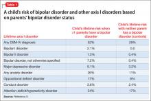 Family history. In the Bipolar Offspring Study,9 the rate of BD in children of parents with BD was 13 times greater than that of controls, and the rate of anxiety and behavior disorders was approximately twice that of children of parents without BD (Table 1).9 This study evaluated 388 children of 233 parents with BD and 251 children of 143 demographically matched controls.