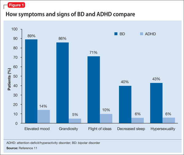There are few studies comparing patients with comorbid BD and ADHD with patients with only ADHD. Geller et al11 compared 60 children with BD and ADHD (mean age, 10) to age- and sex-matched patients with ADHD and no mood disorder. Compared with children who had ADHD, those with BD exhibited significantly greater elevated mood, grandiosity, flight and/or racing of ideas, decreased need for sleep, and hypersexuality (Figure 1,11). Features common to both groups—and therefore not useful in differentiating the disorders—included irritability, hyperactivity, accelerated speech, and distractibility.