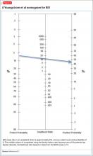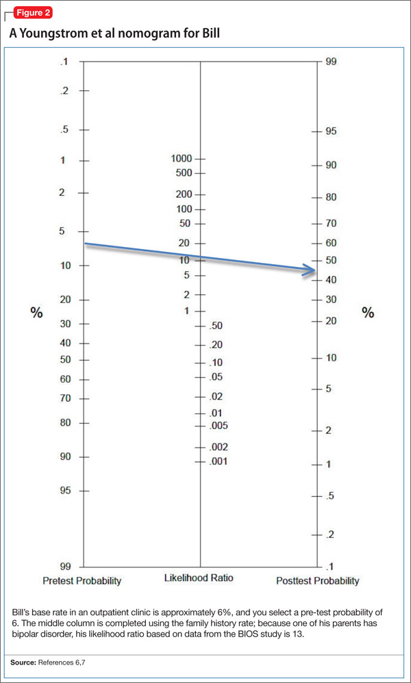 Completing the nomogram developed by Youngstrom et al6,7 using these variables (see this article at CurrentPsychiatry.com for Figure 2)6,7 gives Bill a post-test probability of approximately 42%. The threshold for moving ahead with assessment and possible treatment, the “test-treatment threshold,” depends on your clinical setting.12,13 Our clinical experience is that, when the post-test probability exceeds 30%, further assessment for BD is warranted.