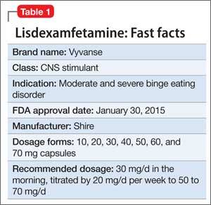 Lisdexamfetamine, approved by the FDA in 2007 for attention-deficit/hyperactivity disorder (ADHD), has a new indication: binge eating disorder (BED) (Table 1). BED is characterized by recurrent episodes of consuming a large amount of food in a short time. A prodrug of amphetamine, lisdexamfetamine is a Schedule-II controlled substance, with a high potential for abuse and the risk of severe psychological or physical dependence.