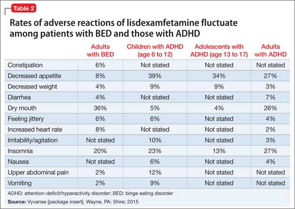 In controlled trials, 5.1% of patients receiving lisdexamfetamine for BED discontinued the drug because of an adverse event, compared with 2.4% of patients receiving placebo. The most common adverse reactions in BED studies were dry mouth (36%), insomnia (20%), decreased appetite (8%), increased heart rate (8%), constipation (6%), and feeling jittery (6%). In trials of children, adolescents, and adults with ADHD, decreased appetite was more common (39%, 34%, and 27%, respectively) than in BED trials (Table 2). Anaphylactic reactions, Stevens-Johnson syndrome, angioedema, and urticaria have been described in postmarketing reports.