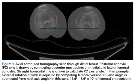 We used the software tool to draw the femoral neck axis. From the end of this line, a straight horizontal line is drawn on-screen (Figure 3). The software calculates the angle formed—the femoral neck axis angle. We assigned a positive value for a femoral head that pointed anteriorly on the image and a negative value for a head that pointed posteriorly. Adjusting for external rotation of the limb involved calculating the femoral version by subtracting the PC angle from the neck axis angle; adjusting for internal rotation involved adding these 2 angles.