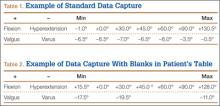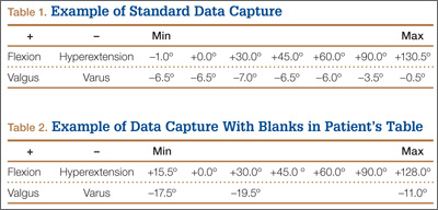 Each patient’s knee varus-valgus angles were captured by Dr. Teo, an adult reconstruction surgeon, in standard fashion from maximal extension to 0º, 30º, 45º, 60º, 90º, and maximal flexion. An example of standard data capture appears in Table 1. With varus-hyperextension defined as –0.5° or less (more negative), neutral as 0°, and valgus-flexion as 0.5° or more, there were 362 varus knees, 41 valgus knees, and no neutral knees.