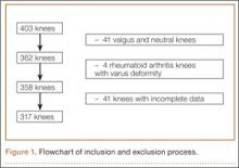 Study inclusion criteria were OA and varus deformity. Exclusion criteria were rheumatoid arthritis, other types of inflammatory arthritis, neuromuscular disorders, knees with valgus angulation, and incomplete data (Table 2). Figure 1 summarizes the inclusion/exclusion process, which left 317 knees available for study. Cases of incomplete data were likely due to computer errors or to inadvertent movement when navigation data were being acquired during surgery.